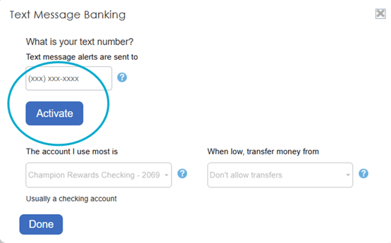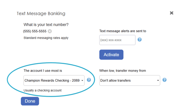 In the "Text Message Banking" modal, review "The account I use most is" selection and update the account, if needed, from the dropdown. (It will likely default to your checking account.)