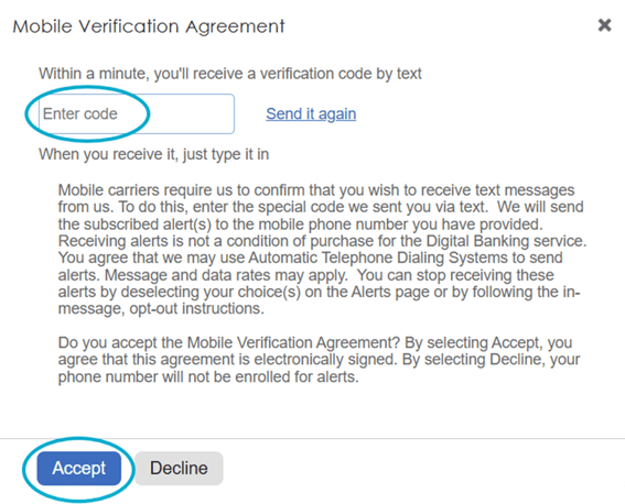 The Mobile Verification Agreement window will appear... In this window, enter the code that you received on your cell phone via text message. (Click "send again" if you did not receive a code).