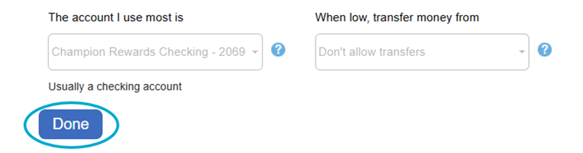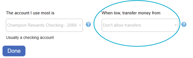 Once you have entered your desired selections in "The account I use most is" and "When low, transfer money from" dropdowns, then click "Done".