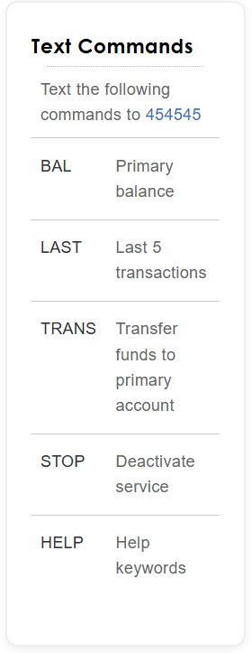 Review the list of text commands online by clicking "notifications" in the top right of your online banking home screen, and reviewing the text commands in the bottom right modal.