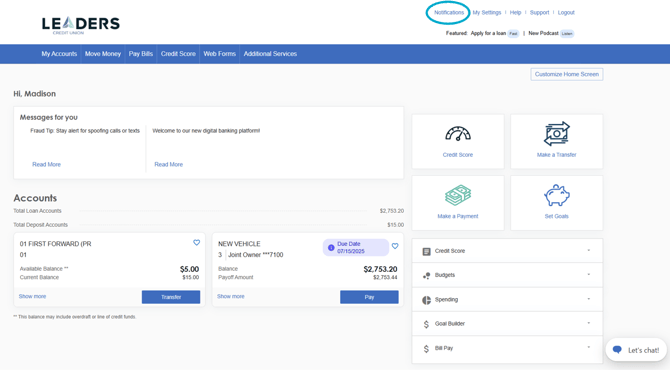 Leaders Credit Union is proud to offer digital banking tools to members at no cost.