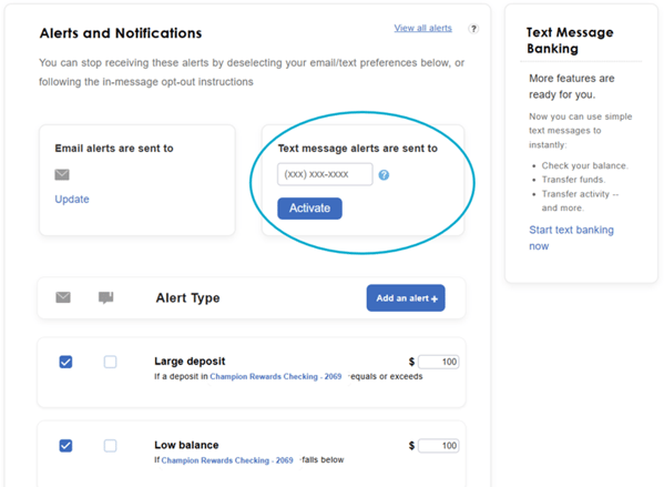 Any alerts that you have set up (i.e. Low balance or Large withdrawal) can be sent to you via text if the text icon is checked for the alert. This also applies for email alerts. Check the box for email or text message alerts for each individual alert and the type of communication you wish to receive.